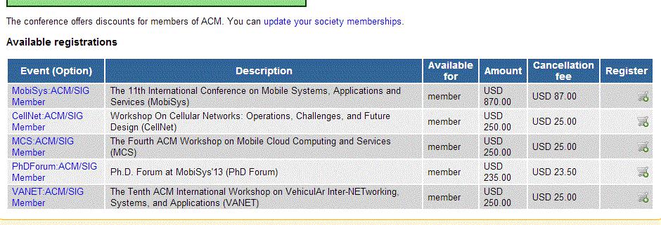 3. Upon logging in, you should see a number of registration options such as illustrated below. If you are an ACM member, make sure you 'update your society memberships' to allow showing of the ACM/SIG Member registration options. Otherwise, the default will be the Non-member options. Extra reception and banquet ticket options will show as soon as you register for the main conference.